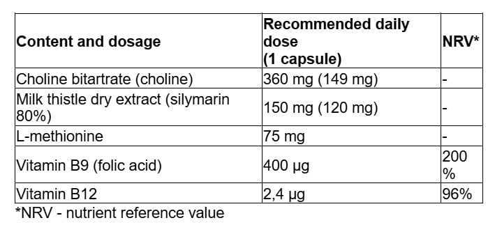 Content: choline bitartrate, milk thistle (Silybum marianum) seed dry extract 30:1 (silymarin 80%), hydroxypropyl methylcellulose (capsule shell, bulking agent), L-methionine, magnesium salts of fatty acids (anti-caking agent), gellan gum (thickener), iron oxides and hydroxides (capsule shell colouring), vitamin B9 (folic acid) (pteroylmonoglutamic acid), vitamin B12 (cyanocobalamin).
