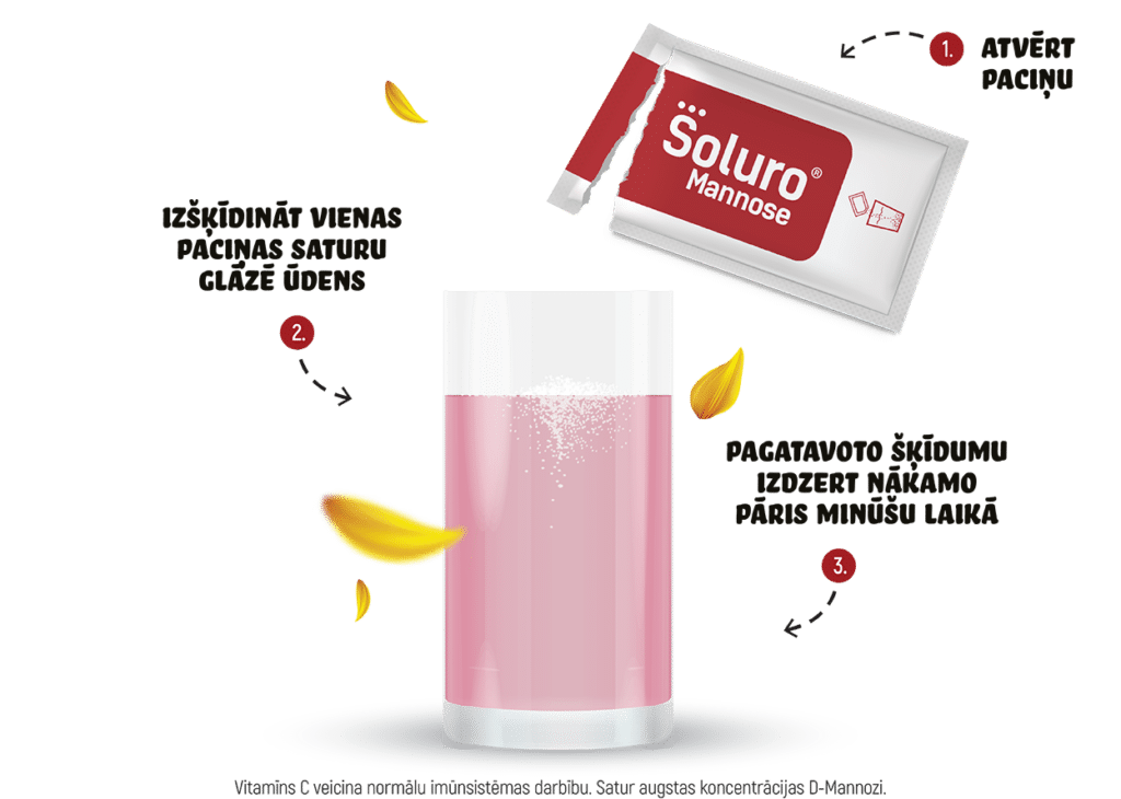Produkts paredzēts urīnceļiem un satur augstas koncentrācijas D-Mannozi, tādā devā, kā minēts Eiropas Urologu Asociācijas vadlīnijās, lielogu dzērveņu ekstraktu, aminoskābes un C vitamīnu. Vitamīns C veicina normālu imūnsistēmas darbību. D-mannoze ir struktūrāli līdzīga uroepitēlija (urīnpūšļa mannozilētiem receptoriem). Soluro® Mannose ir pirmais D-Mannozes saturošs produkts Latvijā ar augstas koncentrācijas devu.
