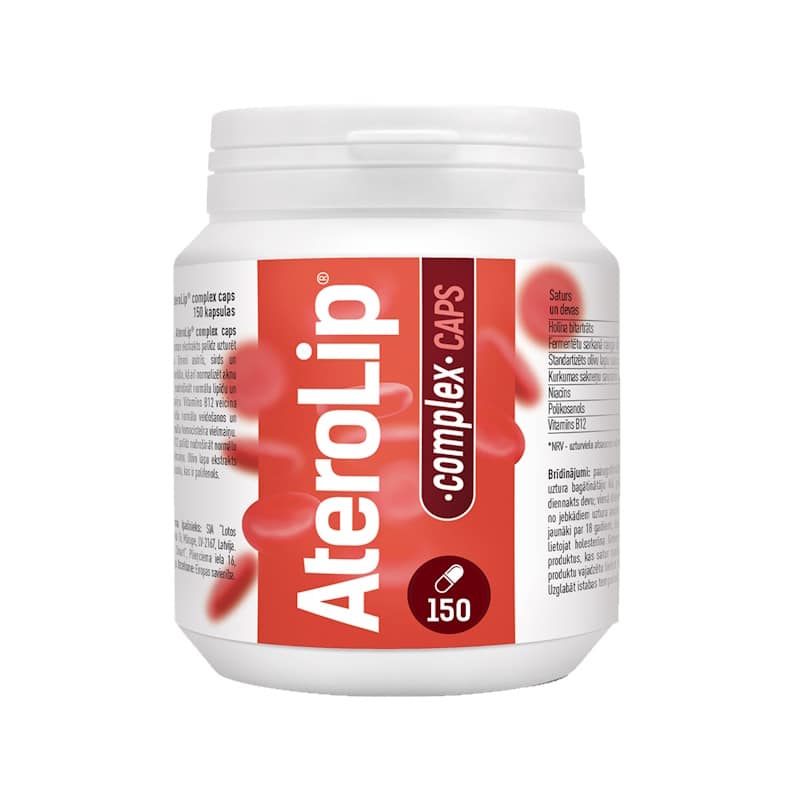 AteroLip® complex caps palīdz uzturēt normālu holesterīna līmeni, jo sastāvā esošais kurkumas ekstrakts palīdz uzturēt normālu holesterīna līmeni asinīs, sirds un asinsvadu sistēmas darbību, kā arī normalizēt aknu lipīdus. Holīns palīdz nodrošināt normālu lipīdu un homocisteīna vielmaiņu. Vitamīns B12 veicina sarkano asinsķermenīšu normālu veidošanos un palīdz nodrošināt normālu homocisteīna vielmaiņu. Niacīns un vitamīns B12 palīdz nodrošināt normālu enerģijas ieguves vielmaiņu. Olīvu lapu ekstrakts satur 20% hidroksitirozolu, kas ir polifenols.
