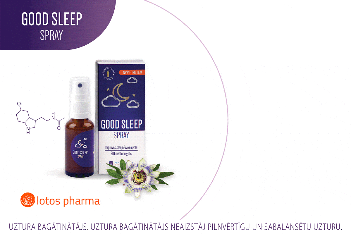 Good Sleep Spray sastāvā esošais melatonīns palīdz samazināt iemigšanai nepieciešamo laiku un atvieglot ar diennakts ritma izjaukšanu saistītās sajūtas. Pasifloras ekstrakts darbojas nomierinoši.