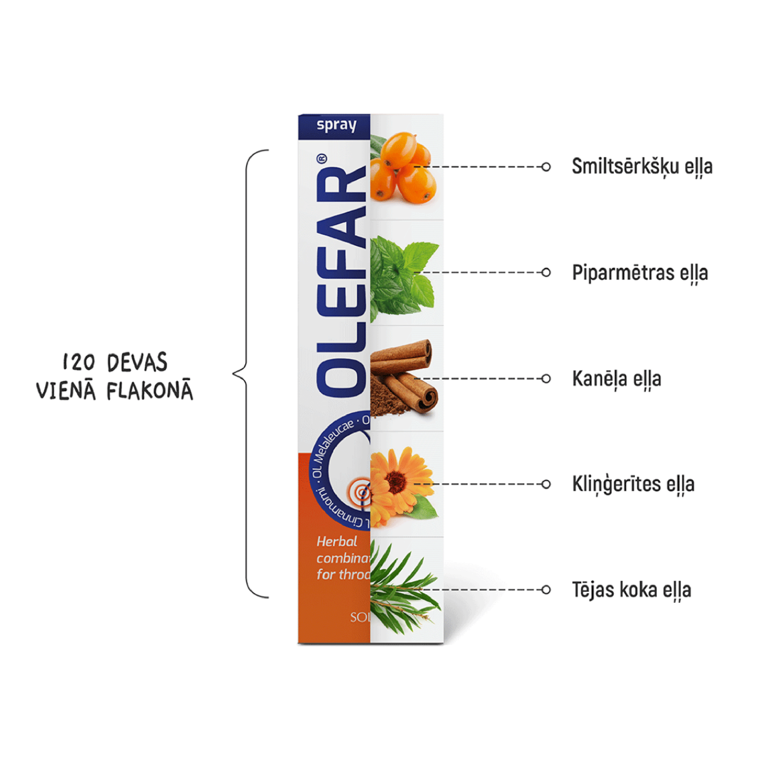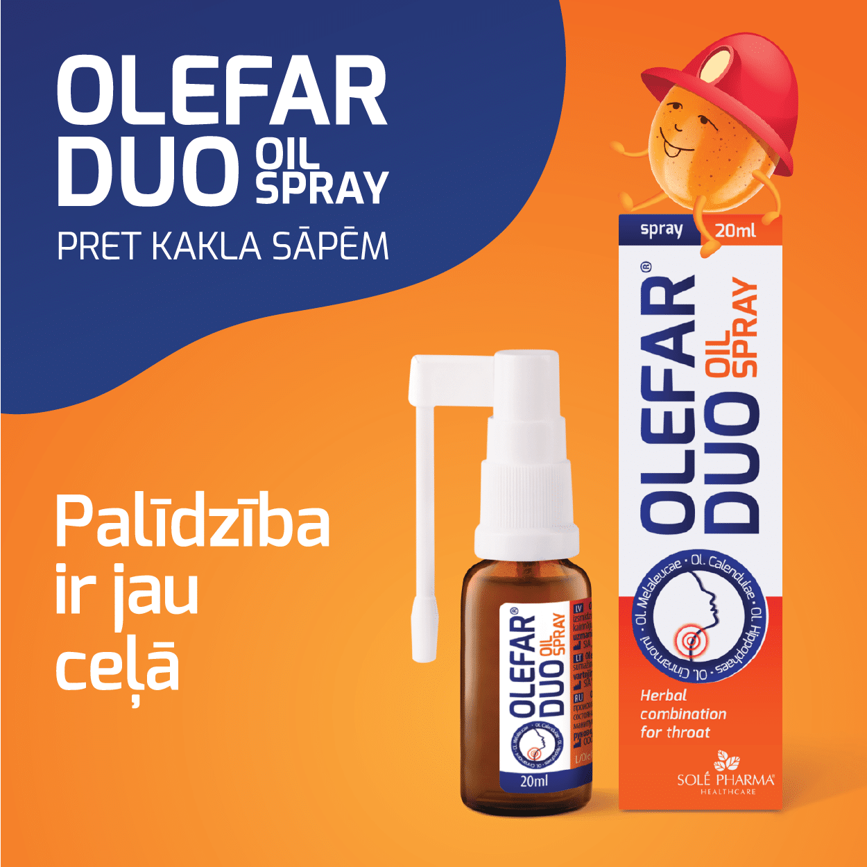 Olefar® DUO Oil Spray ir uz eļļas bāzes veidots līdzeklis, kura sastāvā esošas dabīgas eļļas pārklāj mutes dobuma un rīkles gala gļotādu, tādējādi palīdz uzturēt gļotādu mitru un elastīgu, mazina diskomforta sajūtu un sāpes, kā arī samazina skrāpēšanas sajūtu kaklā.
