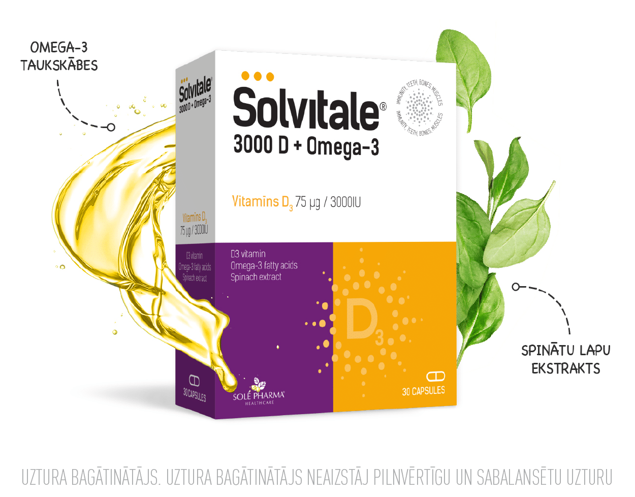 Solvitale® 3000 D + Omega-3 ir domāts cilvēkiem ar D3 vitamīna trūkumu. Tas ir piemērots imūnsistēmas darbības veicināšanai, normālu zobu, kaulu un muskuļu veselības uzturēšanai.